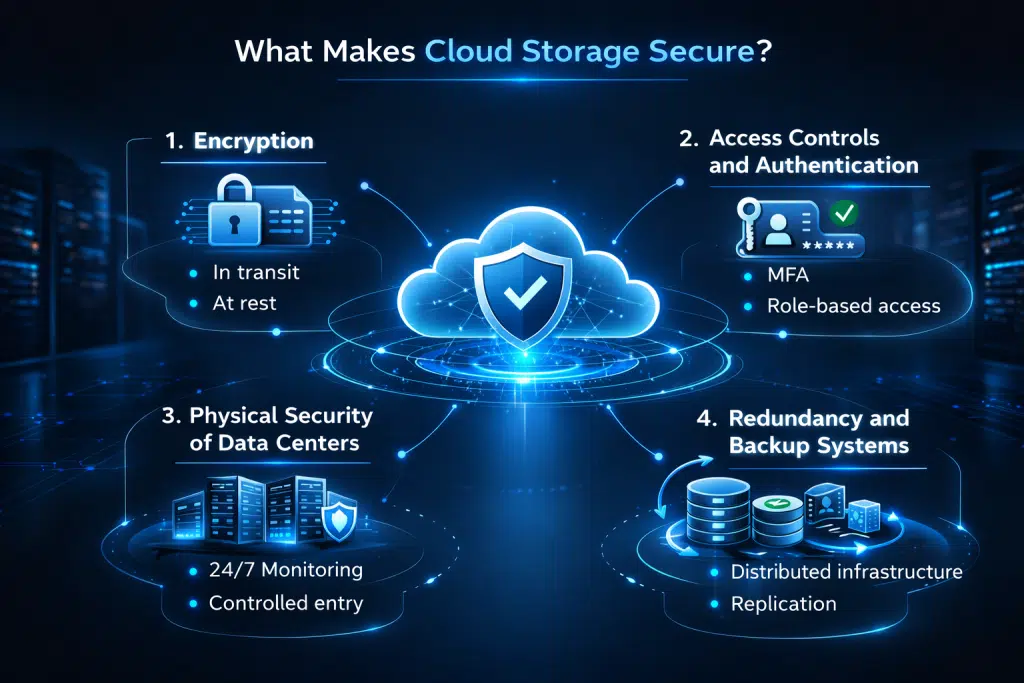 Cloud storage providers use multiple layers of protection designed to safeguard data from unauthorized access, loss, and cyber threats.